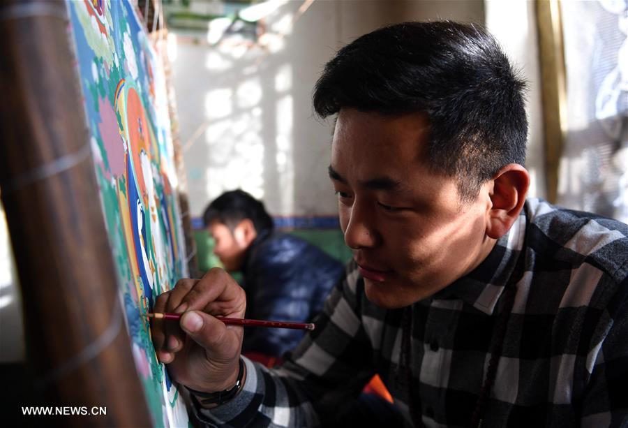 An artist makes Tangka painting in a Tangka shop near Porgor Street of Lhasa, capital of southwest China's Tibet Autonomous Region, Nov. 29, 2017. Tangka, a style of Tibetan art that involves painting on embroidery, has been liked by tourists thanks to a thriving development of tourism in Tibet region, where over 2,000 Tangka artists can create about 1,000 pieces of Tangka paintings every year. (Xinhua/Jigme Dorje)?