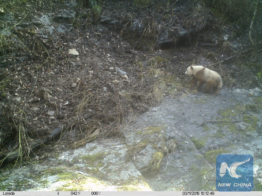 A brown giant panda was spotted in the Changqing National Nature Reserve, northwest China's Shaanxi Province, March 11, 2018.(Xinhua/Changqing National Nature Reserve)