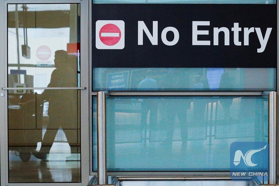 International travelers (reflected in a closed door) arrive on the day that U.S. President Donald Trump's limited travel ban, approved by the U.S. Supreme Court, goes into effect, at Logan Airportin Boston, Massachusetts, U.S., June 29, 2017. (Xinhua/REUTERS)