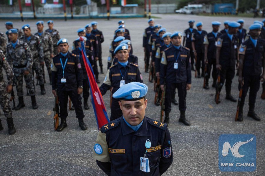 The Nepalese garrison stands at attention during the official closing ceremony of the United Nations Stabilization Mission in Haiti(MINUSTAH) in Tabarre Haiti on Oct. 5, 2017. (Xinhua/AFP)