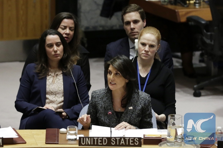 U.S. Ambassador to the United Nations Nikki Haley (Front) speaks after the UN Security Council adopted a resolution demanding a ceasefire across Syria at the UN headquarters in New York, on Feb. 24, 2018. (Xinhua/Li Muzi)