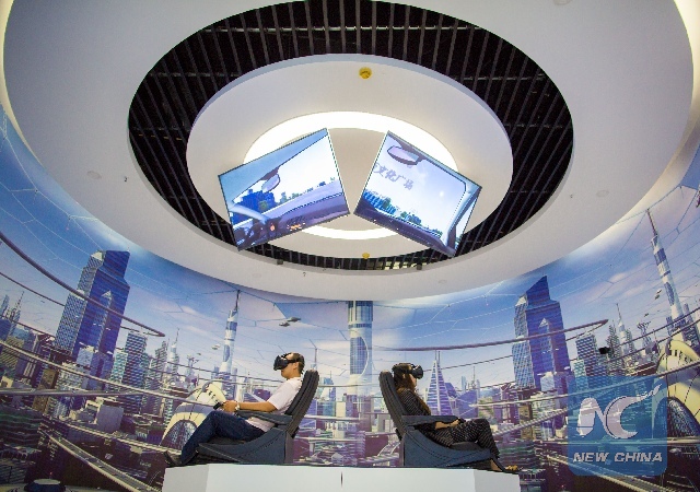 People experience VR(Visual Reality) glasses at Isoftstone big data industry center in Yuquan District of Hohhot, capital of north China's Inner Mongolia Autonomous Region, Aug. 1, 2017. (Xinhua/Ding Genhou)
