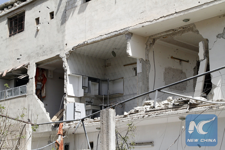 DOUMA, Syria, April 21 (Xinhua) -- "Why are you living in a destroyed home? This is my house, where else should I go?" Ahmad muttered, standing in his home, of which walls and windows had been destroyed in Douma district east of Damascus.