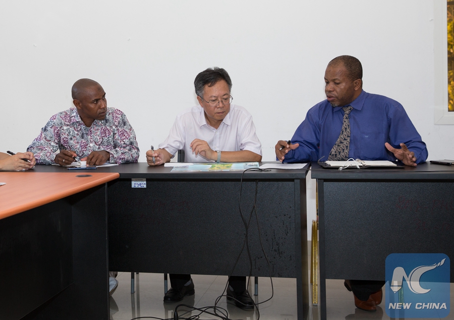 Song Jianping (C), who heads the visiting team from Guangzhou University of Chinese Medicine (GZUCM) of southern China, exchanges views with chief of Comoros' national anti-malaria program Affane Barcar (1st R) during a meeting in Comoros' anti-malaria center, in Comoros, on April 18, 2018. (Xinhua/Lyu Shuai)