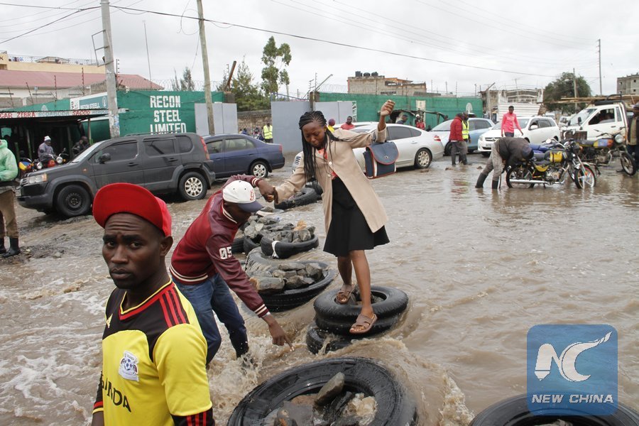 A woman is being assisted to cross a flooded road in Nairobi, capital of Kenya, April 24, 2018. (Xinhua/Fred Mutune)
