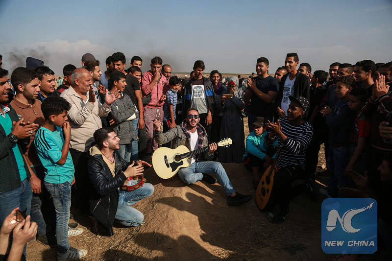 Palestinians youth play music and singing the Palestinian Natinal Anthem during the mass rally, known as the "Great March of Return", near the border between eastern Gaza Strip and Israel, on April 27, 2018. (Xinhua)