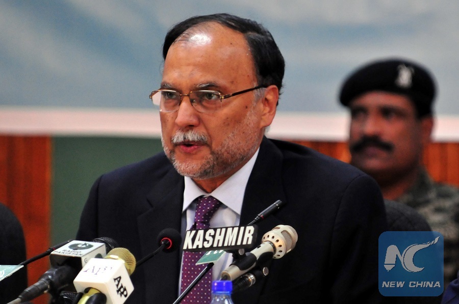 File photo taken on April 26, 2018 shows Pakistani Interior Minister Ahsan Iqbal speaking during an event in Islamabad, Pakistan. (Xinhua/Ahmad Kamal)