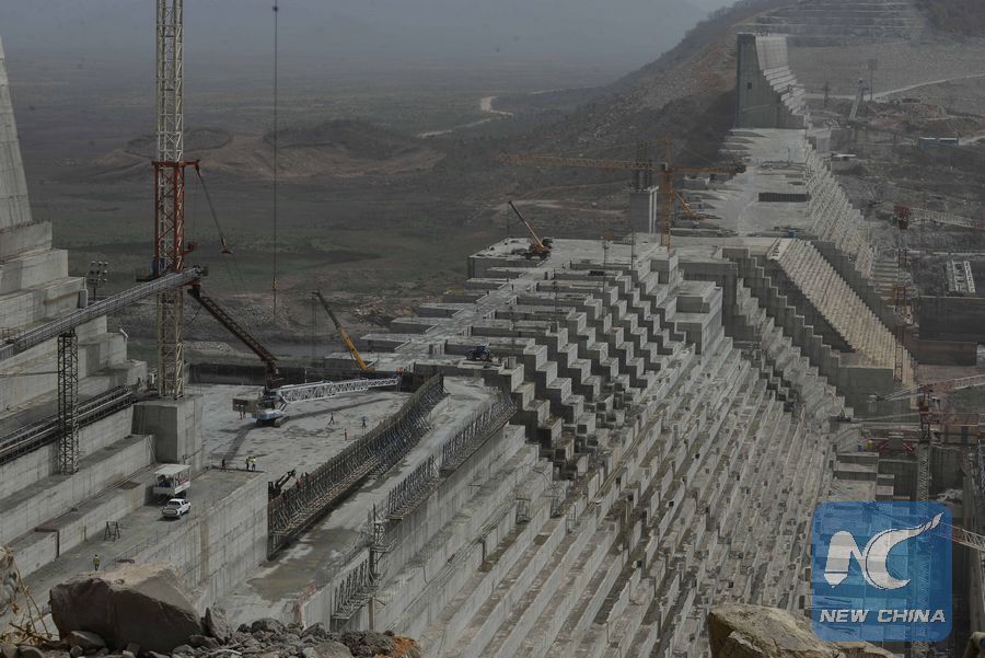 Photo taken on April 2, 2018 shows a mega dam in Guba, Ethiopia. The 6,450 Mega Watts hydro-dam named Grand Ethiopian Renaissance Dam (GERD) is the largest hydro-project in Africa. GERD is currently at 65 percent completion and will require about five billion U.S. dollars to be complete. (Xinhua/Michael Tewelde)