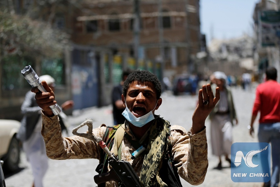 File Photo: A Houthi militant tries to block people from entering a street where the presidential compound was hit by air strikes in Sanaa, Yemen, May 7, 2018. (Xinhua/REUTERS)