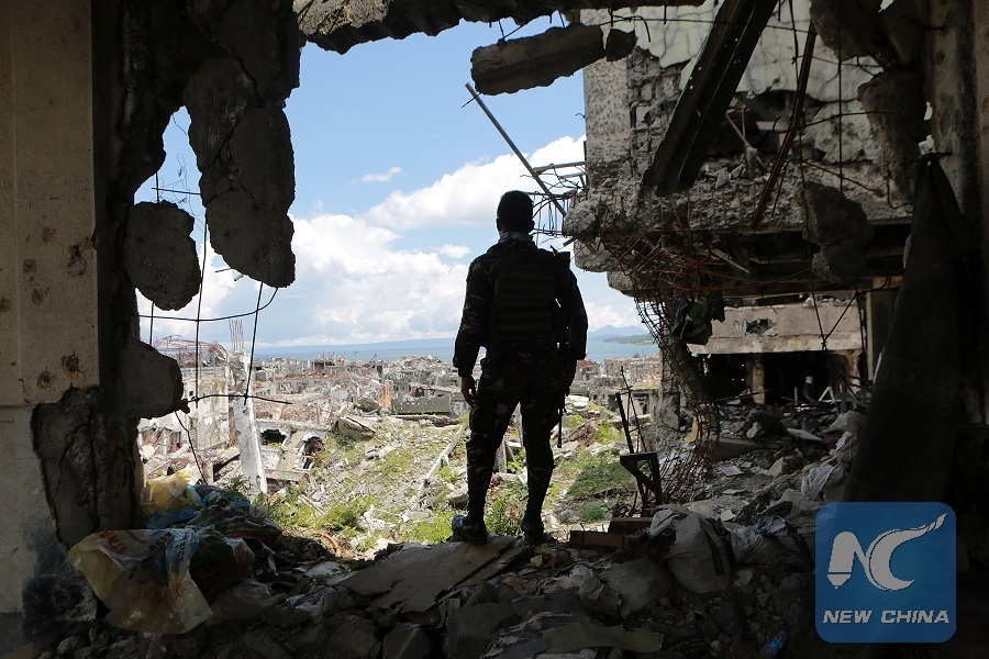 A soldier from the Armed Forces of the Philippines looks at destroyed buildings in the war-torn Marawi City, the Philippines, May 22, 2018. (Xinhua/Rouelle Umali)