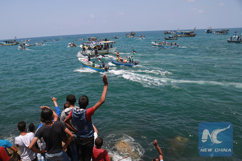 Fishing boats seen carrying a group of Palestinian patients and students trying to breach Israel's naval blockade on Gaza, at the sea in Gaza City, on May 29, 2018. (Xinhua/Stringer)