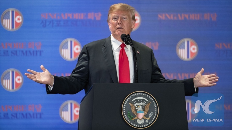U.S. President Donald Trump speaks during a press conference in Singapore on June 12, 2018. (Xinhua/Zhu Hongye)