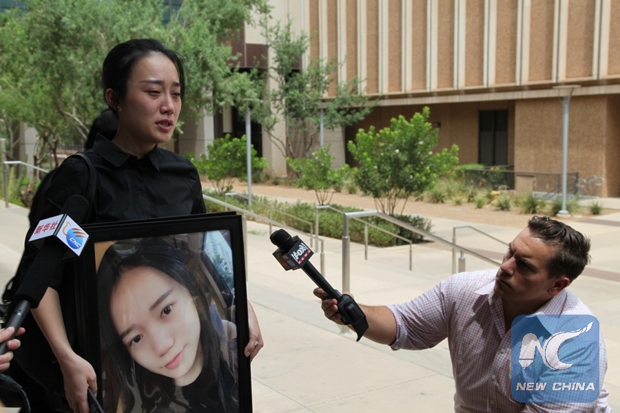 Jiang Yue's cousin Xu Xiang is interviewed by media outside the Maricopa County Superior Court in Phoenix, Arizona, the United States, June 15, 2018. (Xinhua/Gao Shan)