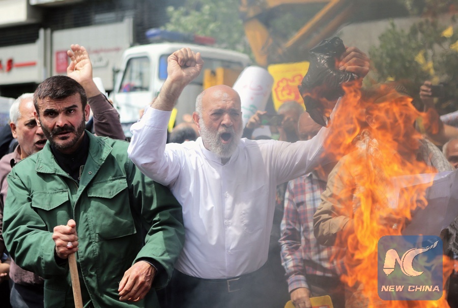 People take part in a protest to condemn U.S. withdrawal from the 2015 Iran nuclear deal in Tehran, Iran, on May 11, 2018. Thousands of people marched on the streets in Tehran chanting anti-U.S. slogans. (Xinhua/Ahmad Halabisaz)