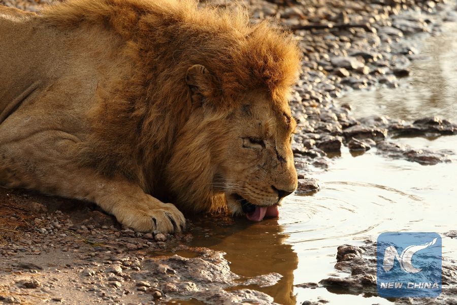 Photo taken on Aug. 18, 2013 shows a lion drinking water in the Serengeti National Park, north Tanzania. (Xinhua/Zhang Ping)