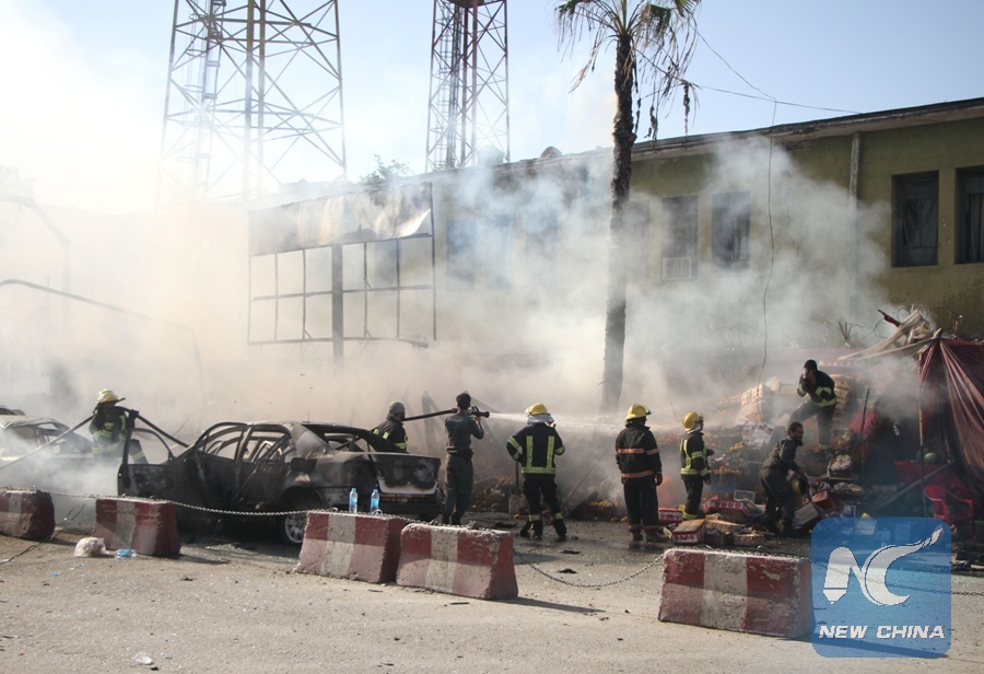 Afghan security force members inspect the site of a suicide attack in Nangarhar Province, Afghanistan, July 1, 2018. (Xinhua/Saifurahman Safi)