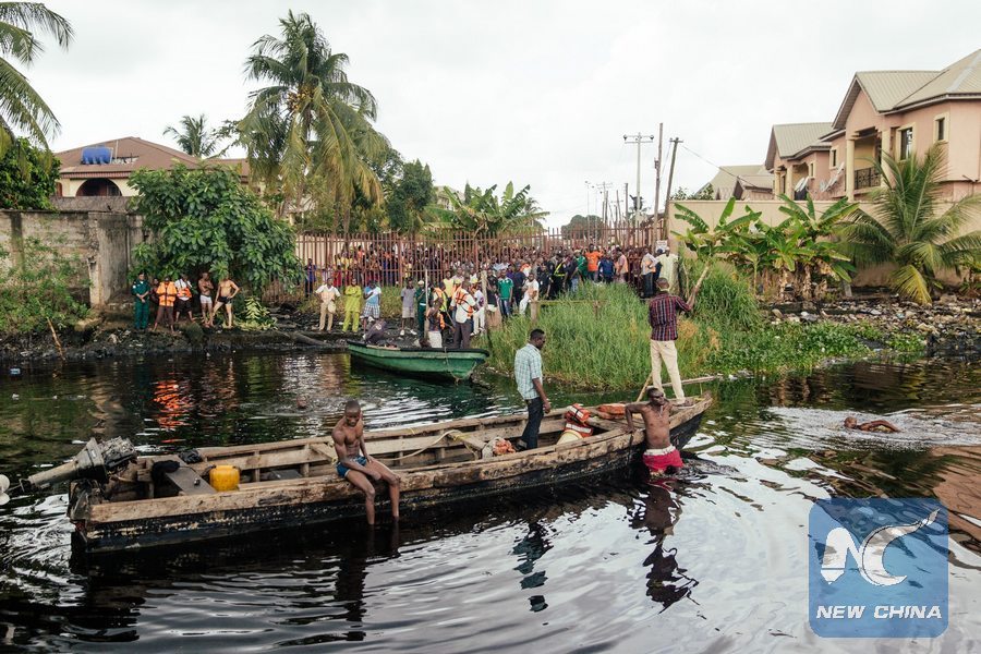File photo shows rescuers at the site of a boat accident in Lagos, Nigeria, March 12, 2014. (Xinhua/Zhang Weiyi)