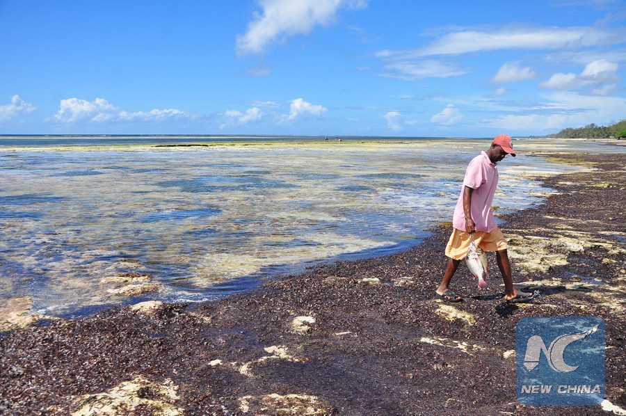 A fisherman takes his white snapper catch back home at Diani reef in the Coastal region of Kenya, April 8, 2013. (Xinhua/Allan Muturi)