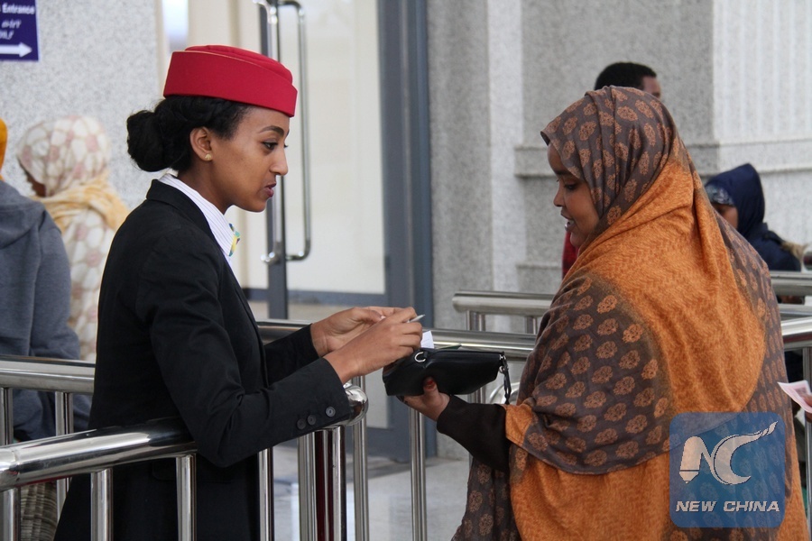 A staff member of the Ethiopia-Djibouti railway inspects the ticket of a passenger in Addis Ababa, capital of Ethiopia, on May 11, 2018. (Xinhua/Lyu Tianran)