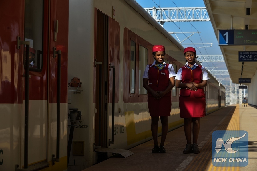 Ethiopian attendants walk along a train at the Lebu station in Addis Ababa, capital of Ethiopia, Jan. 1, 2018. (Xinhua/Michael Tewelde)