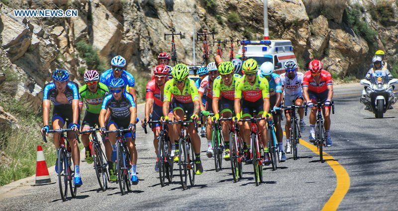 Cyclists compete in the fourth stage of the Tour of Qinghai Lake in northwest China's Qinghai Province, on July 25, 2018. (Xinhuanet Photo by Lu Mi)