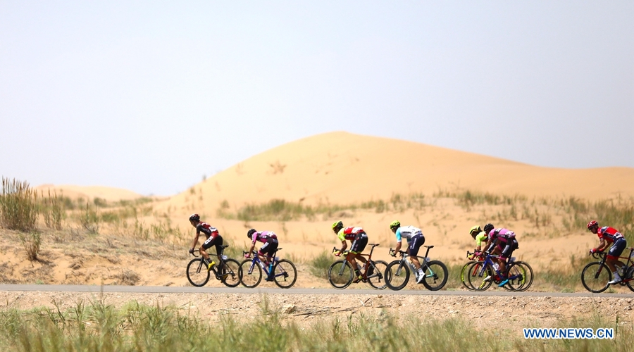 Cyclists compete in the Tenggeli desert in the tenth stage of the Tour of Qinghai Lake in northwest China's Gansu Province, on August 1, 2018. (Xinhuanet Photo by Jia Haiyuan)
