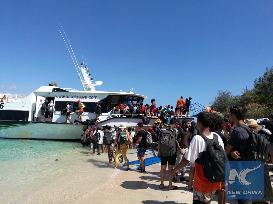 Visitors evacuate from Gili Trawangan near Lombok Island in Central Indonesia, Aug. 6, 2018. (Xinhua/Liang Fangfang)