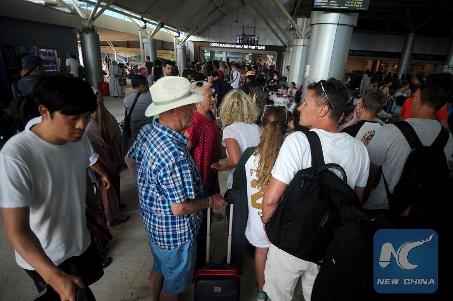 Tourists wait to check in at Praya International airport on Lombok Island, Indonesia, Aug. 6, 2018. (Xinhua/Agung Kuncahya B.)