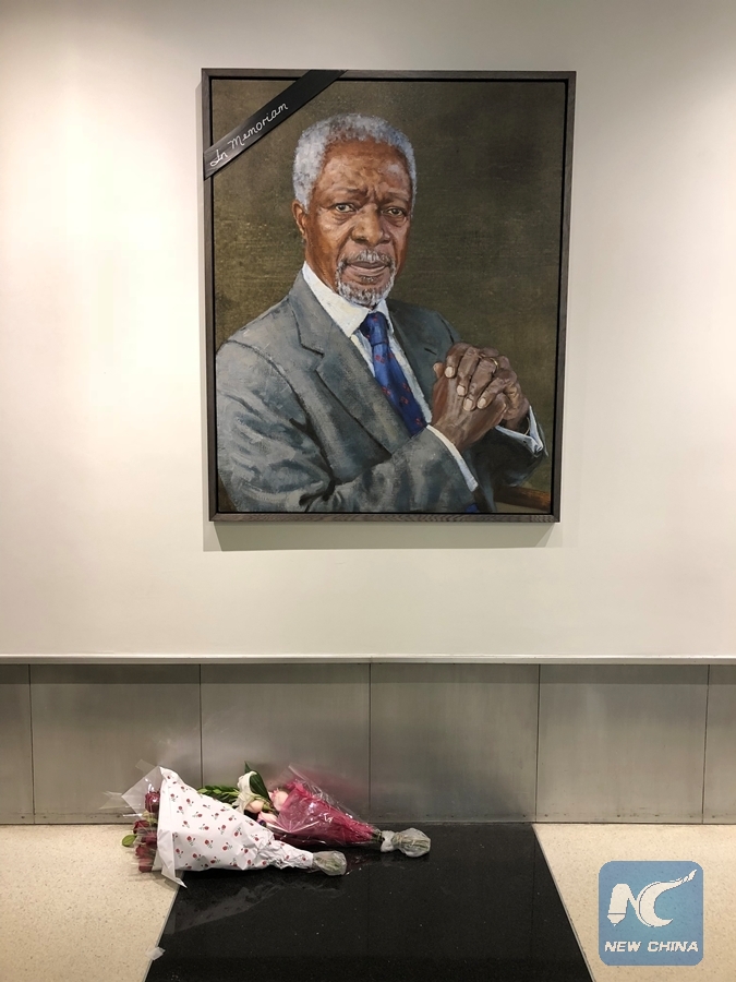 Flowers are put under the portrait of former Secretary-General Kofi Annan at UN headquarters, Aug. 18, 2018. (Xinhua/Li Muzi)former Secretary-General Kofi Annan, Aug. 18, 2018. (Xinhua/Li Muzi)