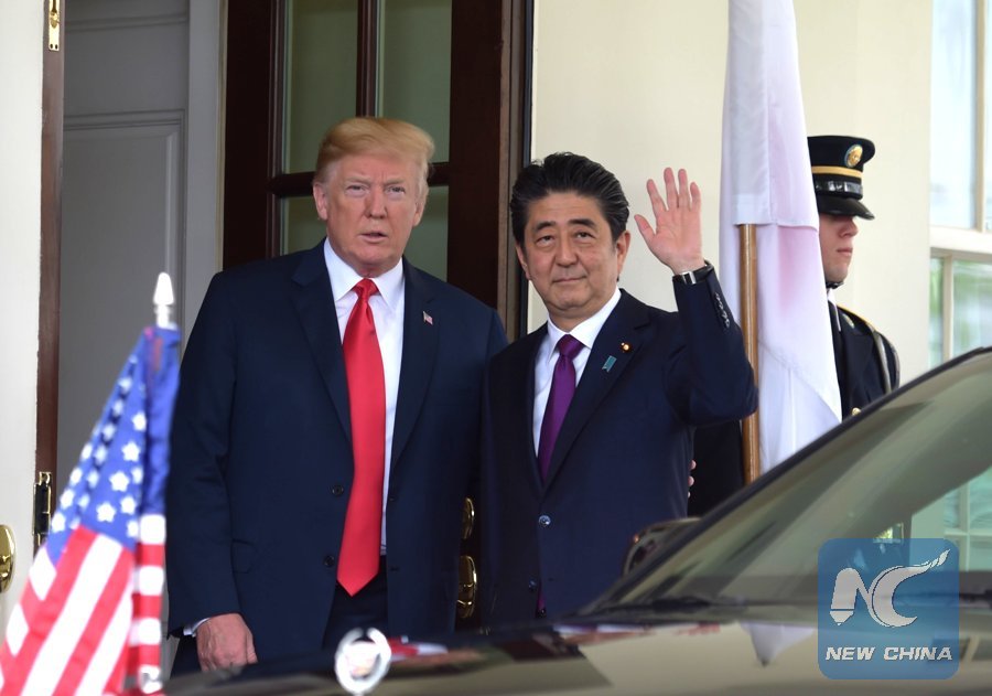 U.S. President Donald Trump (1st L) welcomes Japanese Prime Minister Shinzo Abe (2nd L) at the White House in Washington D.C., the United States, on June 7, 2018. (Xinhua/Yang Chenglin)