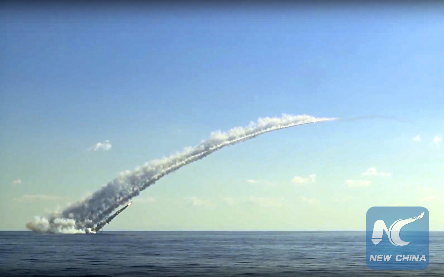 A Russian submarine in the Mediterranean fires a long-range Kalibr cruise missile at the Islamic State group's positions in Syria on Oct. 5, 2017.