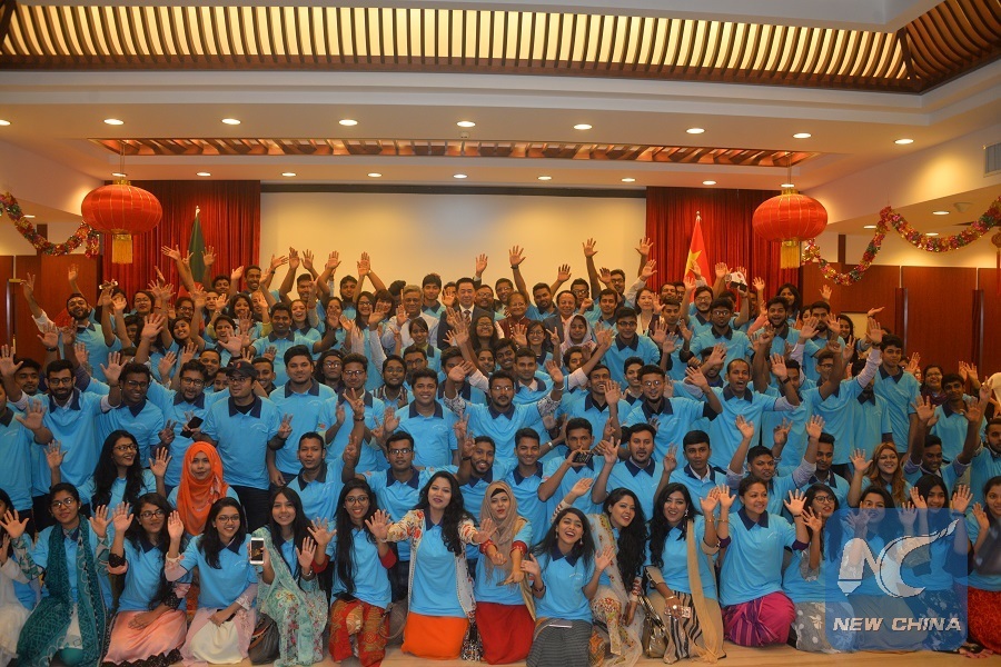 Participants of Bangladesh-China Youth Camp pose for group photos during an orientation program at the Chinese Embassy in Dhaka, Bangladesh on Aug. 30, 2018. (Xinhua/Naim-Ul-Karim)