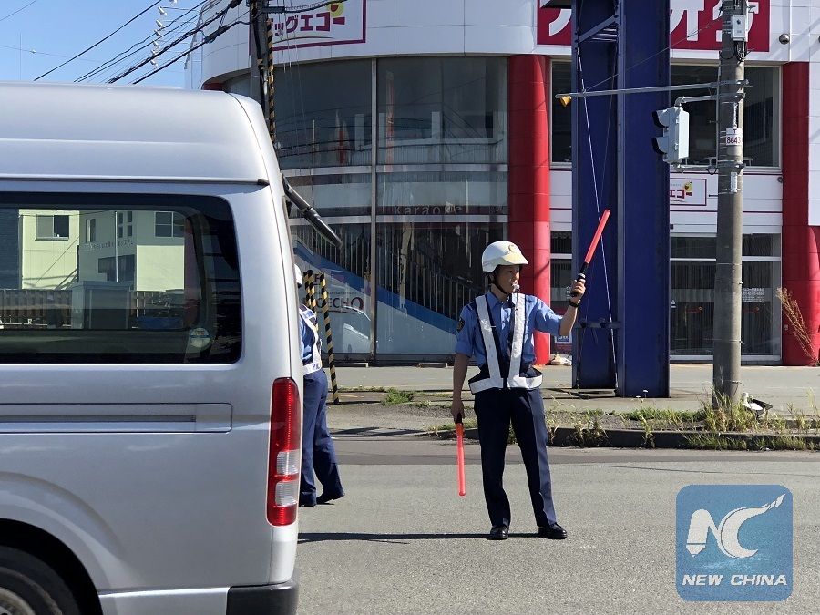 A policeman directs traffic after an earthquake in Date, Hokkaido, Japan, on Sept. 6, 2018. (Xinhua/Deng Min)