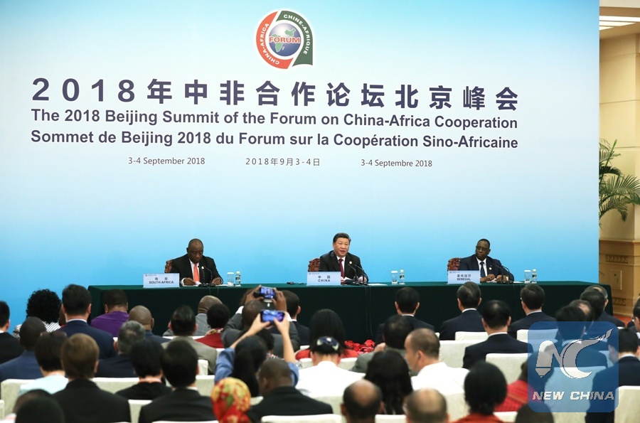 Chinese President Xi Jinping (C, back) meets the press together with South African President Cyril Ramaphosa (L, back) and Senegalese President Macky Sall, former and new African co-chair of the Forum on China-AfricaCooperation (FOCAC), after the conclusion of the 2018 FOCAC Beijing Summit at the Great Hall of the People in Beijing, capital of China, on Sept. 4, 2018. (Xinhua/Liu Weibing)