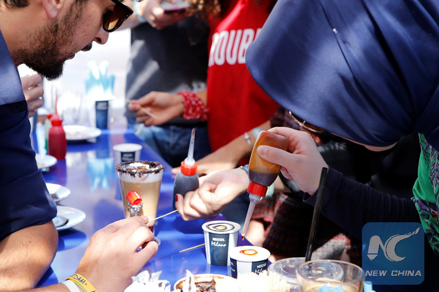 A girl learns to make coffee latte during the Ankara Coffee Festival on Sept. 29, 2018, in Ankara, Turkey. (Xinhua/Qin Yanyang)
