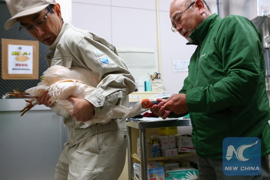 A crested ibis from China receives physical examination at the Sado Japanese Crested Ibis Conservation Center in Niigata Prefecture, Japan, Oct. 17, 2018. (Xinhua/Ma Caoran)