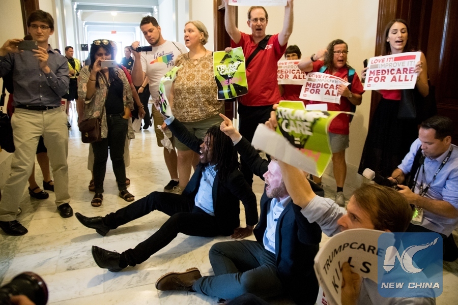 People participate in a protest against Republican health care bill in Russell Senate Office Building on Capitol Hill in Washington D.C., the United States, July 10, 2017. (Xinhua/Ting Shen)