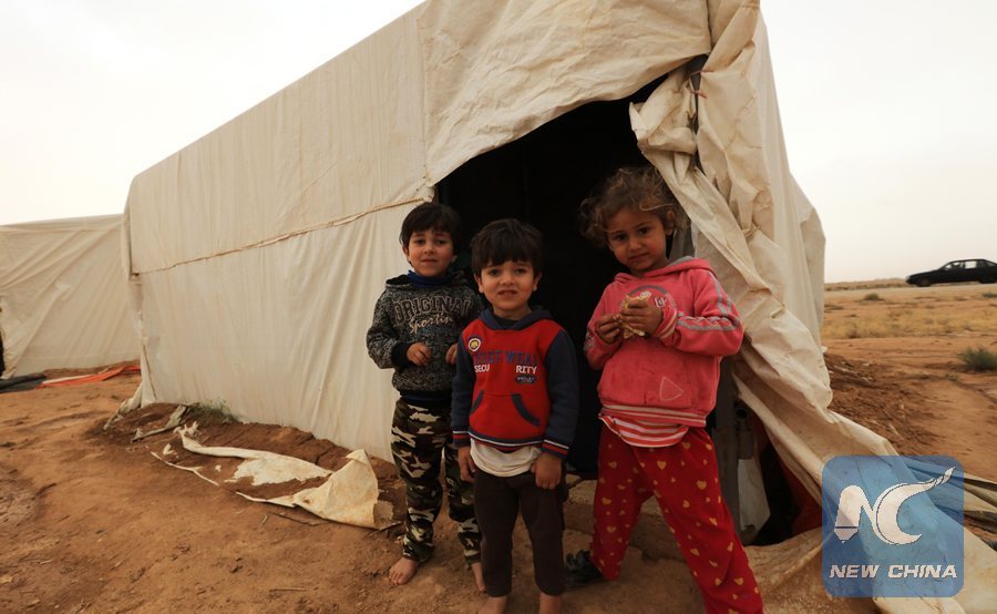 Syrian refugee children are seen at a settlement near the Jordan-Syria border on the outskirts of Mafraq, Jordan, on April 26, 2018. According to a 2018 report of the United Nations Higher Commission for Refugees, about 160,000 registered Syrian refugees reside in Mafraq, a city situated about 70 kilometers north of the capital Amman. (Xinhua/Mohammad Abu Ghosh)