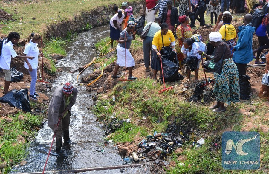 File photo shows volunteers clean up a section of river Kirichwa Kibwa during the World Water Day celebration in Nairobi, capital of Kenya, March 22, 2017. (Xinhua/Allan Mutiso)