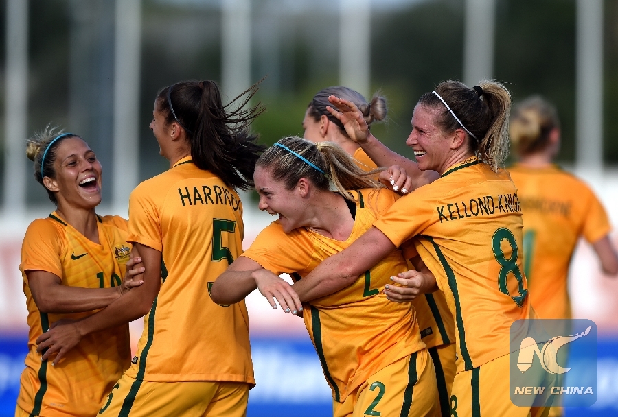 Players of the Australian women's football team celebrate goal at the Algarve Cup on March 7, 2017 (Xinhua/Zhang Liyun)