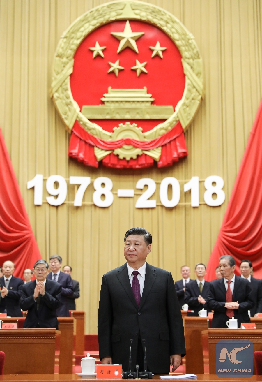 Chinese President Xi Jinping, also general secretary of the Communist Party of China (CPC) Central Committee and chairman of the Central Military Commission, attends a grand gathering to celebrate the 40th anniversary of the country's reform and opening-up at the Great Hall of the People in Beijing, capital of China, Dec. 18, 2018. (Xinhua/Ju Peng)