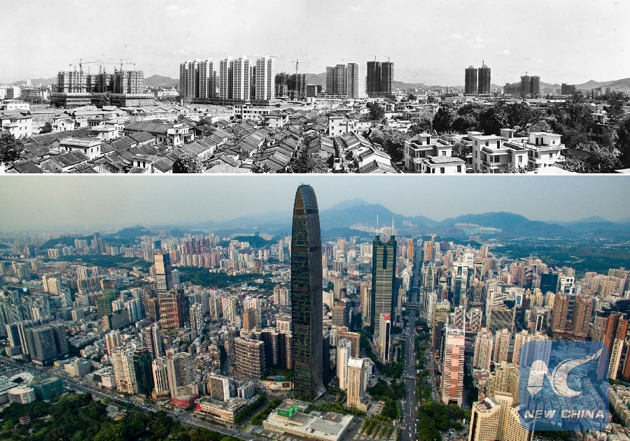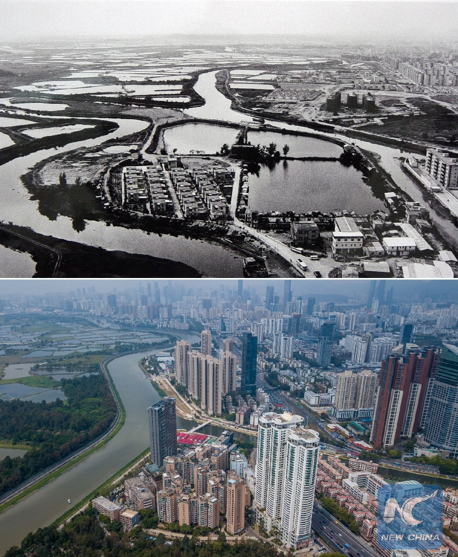 The upper part (file) of this combo photo shows Yumin Village in the 1980s in Shenzhen, south China's Guangdong Province. The lower part taken on March 26, 2018 shows a new look of the village. (Xinhua)