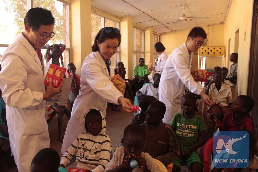 File photo shows Chinese doctors in South Sudan distribute Christmas gifts to Juba Orphanage Home in Juba, capital of South Sudan, Dec. 20, 2017.(Xinhua/Gale Julius)
