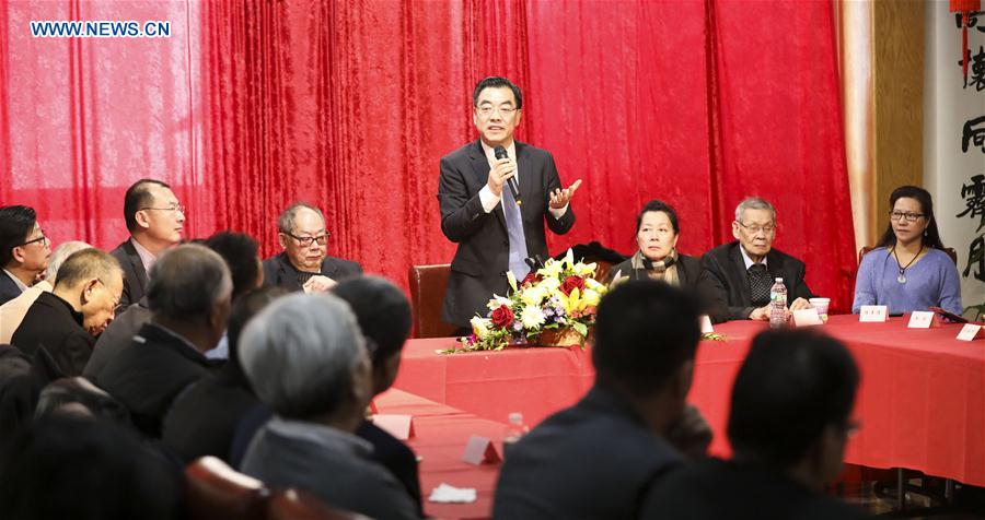 Huang Ping, Chinese consul general in New York, speaks as he meets with representatives from the Chinese community in Philadelphia, the U.S. state of Pennsylvania, Jan. 6, 2019. The Chinese community in the United States should continue to play their unique role as "positive energy" in cementing China-U.S. ties, Huang said here Sunday. (Xinhua/Wang Ying)