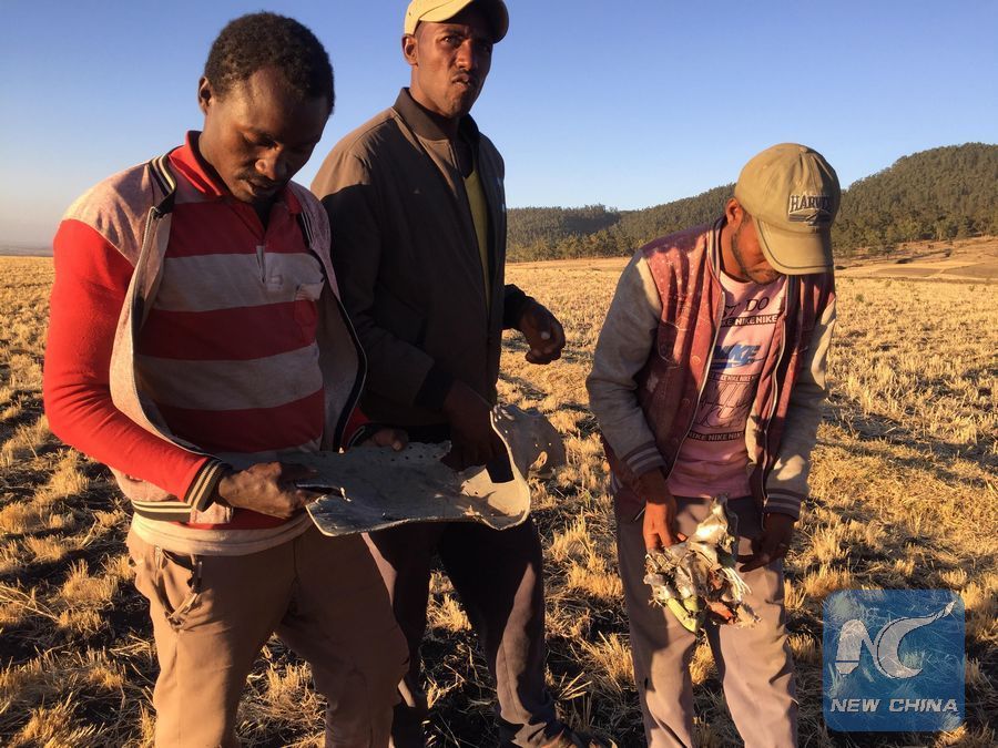 Photo shows local people looking for wreckage of an Ethiopian Airlines aircraft at the crash site near Bishoftu town, about 45 km from the capital Addis Ababa, Ethiopia. (Xinhua/Michael Tewelde)