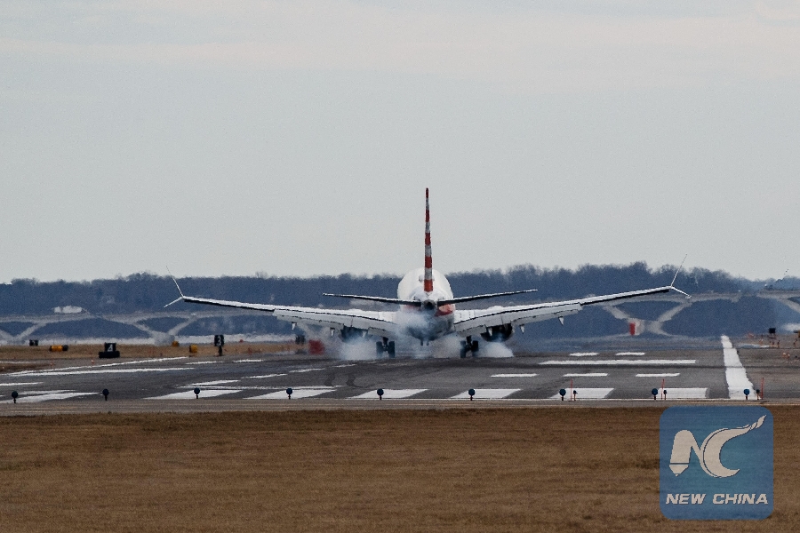 An American Airlines Boeing 737 Max 8 aircraft from Los Angeles lands at Washington Reagan National Airport in Washington D.C., the United States on March 13, 2019. The United States is grounding all Boeing 737 Max 8 and 9 aircraft, said U.S. President Donald Trump Wednesday, as the country becomes the last major country to do so after two crashes by the model in recent months. (Xinhua/Ting Shen)