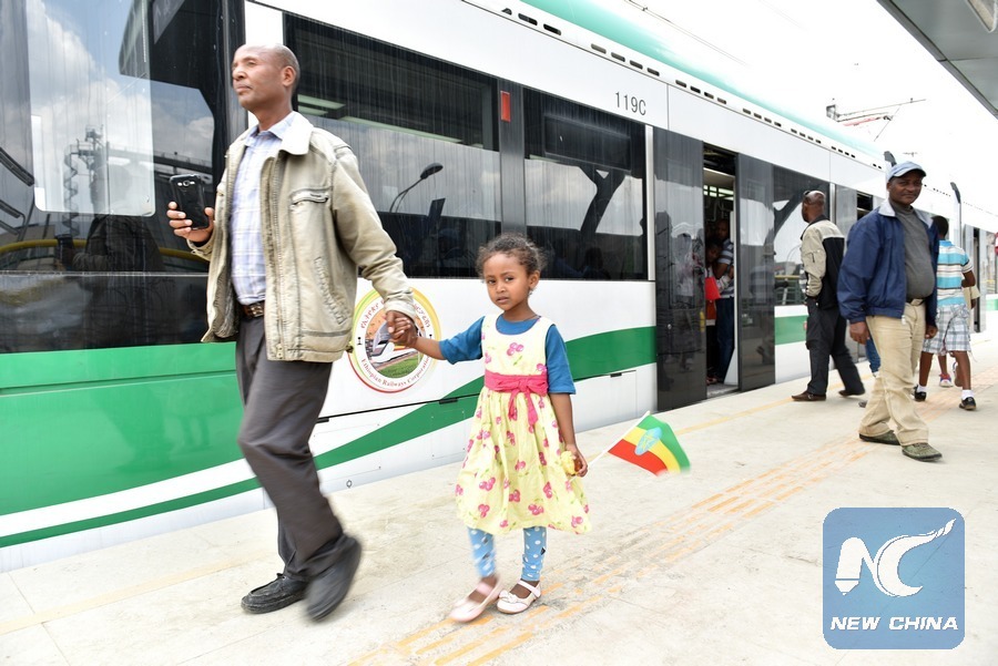 Photo taken on Sept. 20, 2015 shows a train operating on the light rail in Addis Ababa, Ethiopia.(Xinhua/Sun Ruibo)