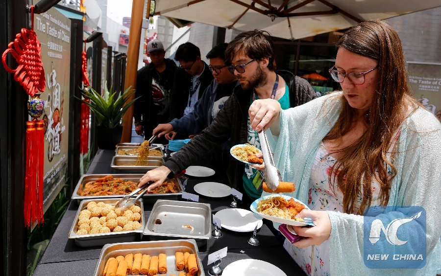 Visitors try Chinese cuisine at "The Taste of China", which is part of the China Tourism and Culture Week in Los Angeles, the United States, May 18, 2019. Organized by the Los Angeles office of China National Tourist Administration, "The Taste of China" was a delicious buffet featuring many of China's favorite gourmet dishes. (Xinhua/Li Ying)