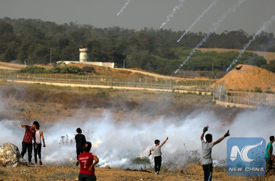 Palestinians run to take cover from tear gas canisters fired by Israeli troops during clashes on the Gaza-Israel border, east of al-Bureij refugee camp in central Gaza Strip, May 24, 2019. (Xinhua/Yasser Qudih)