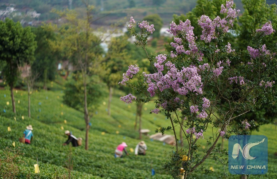 Tea farmers work at an organic tea garden in Pu'er City, southwest China's Yunnan Province, May 31, 2019. Many tea gardens in Pu'er City have entered harvest season. (Xinhua/Qin Qing)